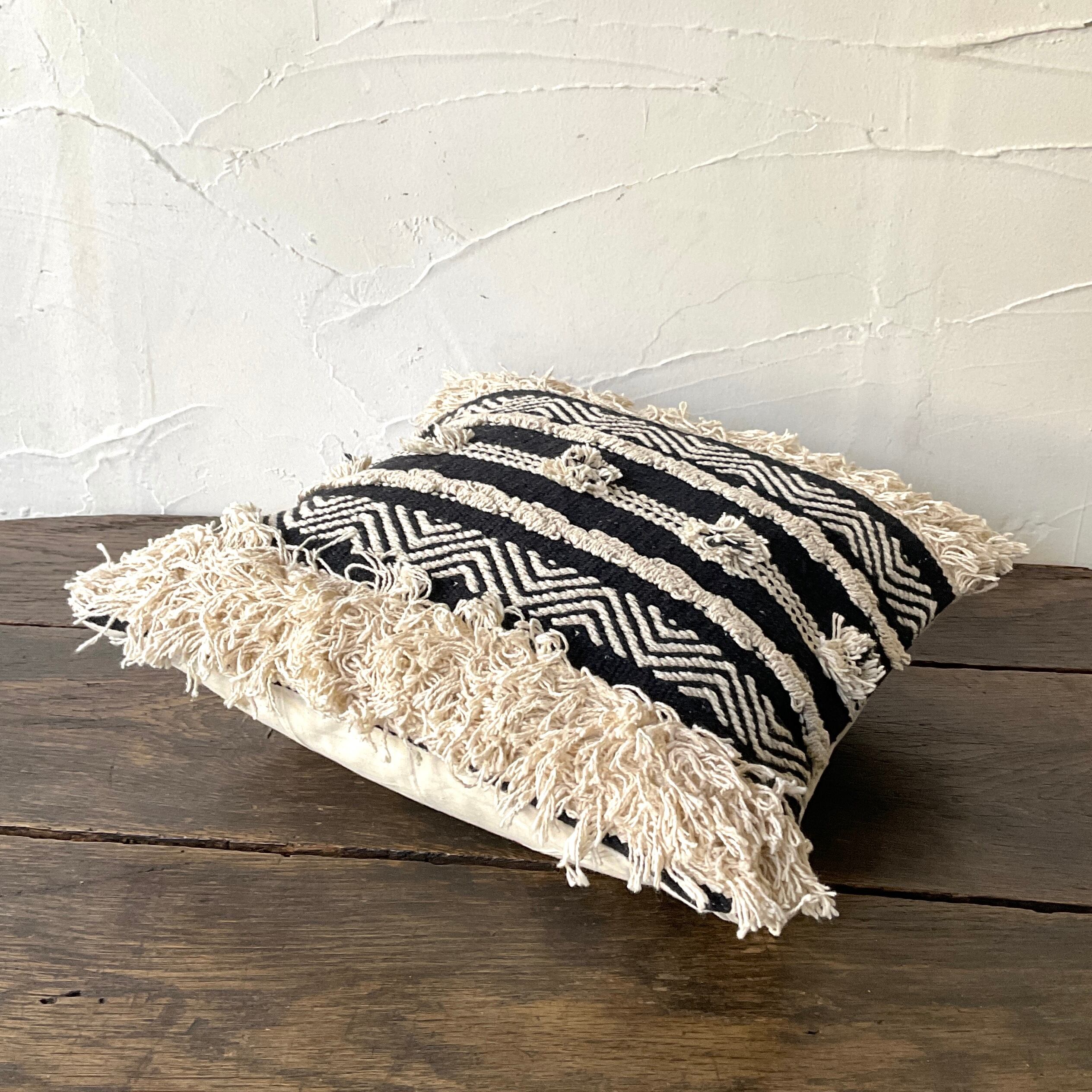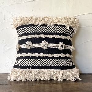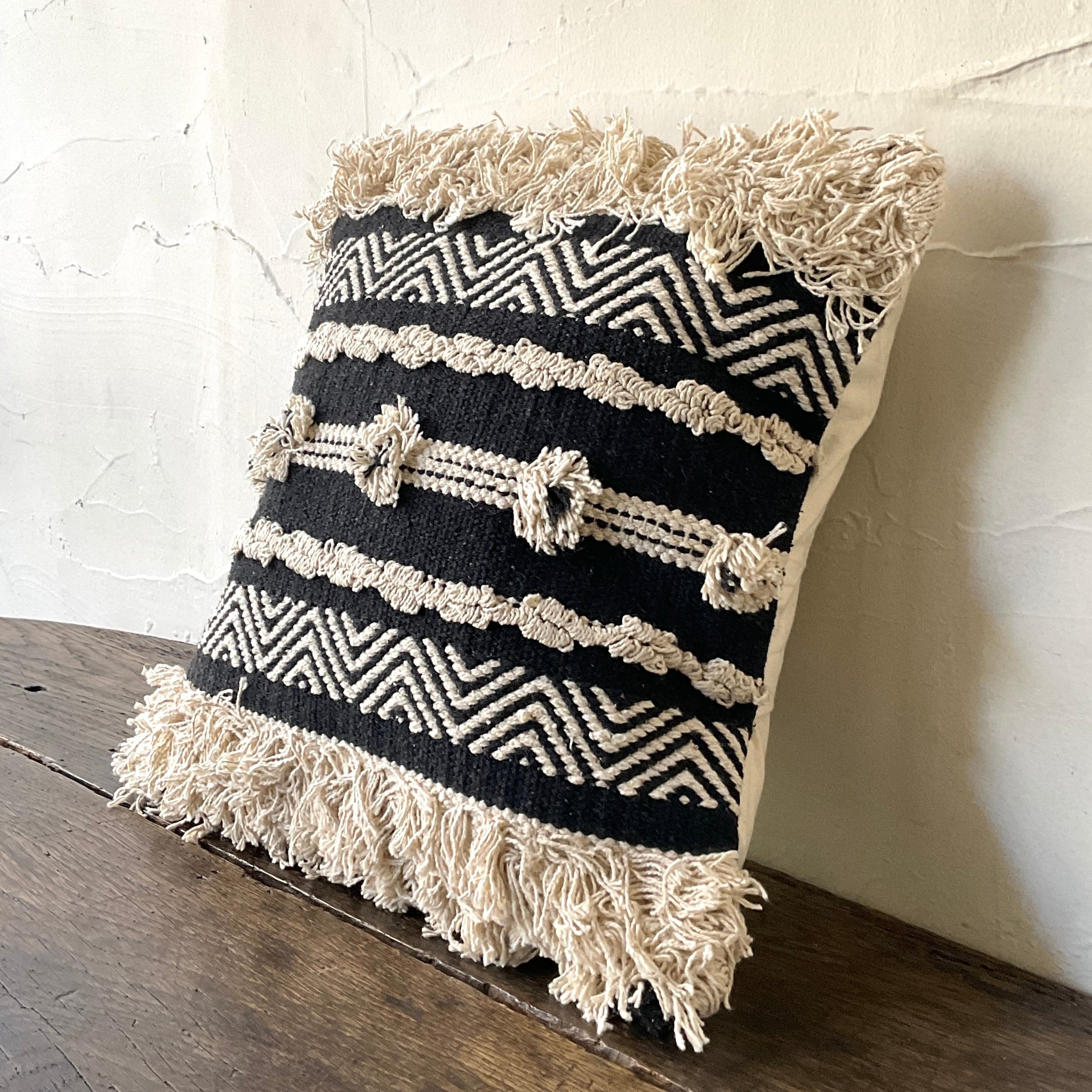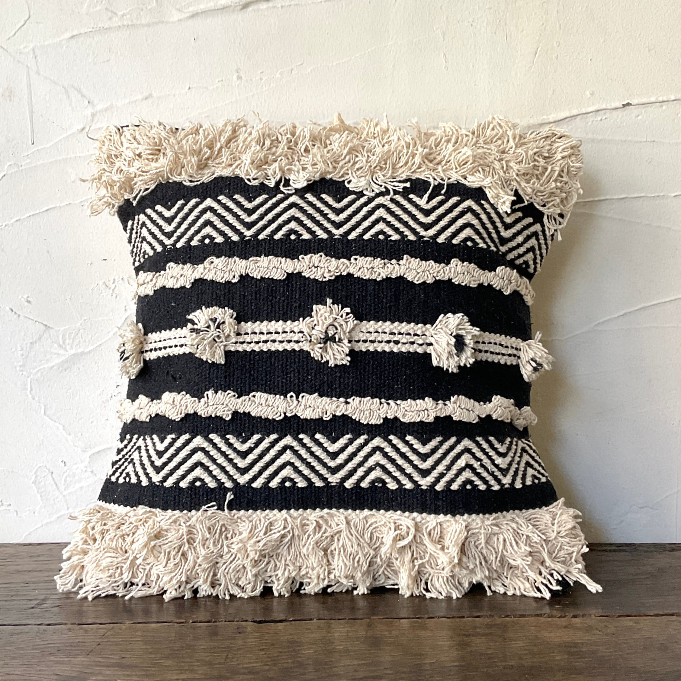【ピープルツリー】手織りフリンジクッションカバー(ブラック×生成り)