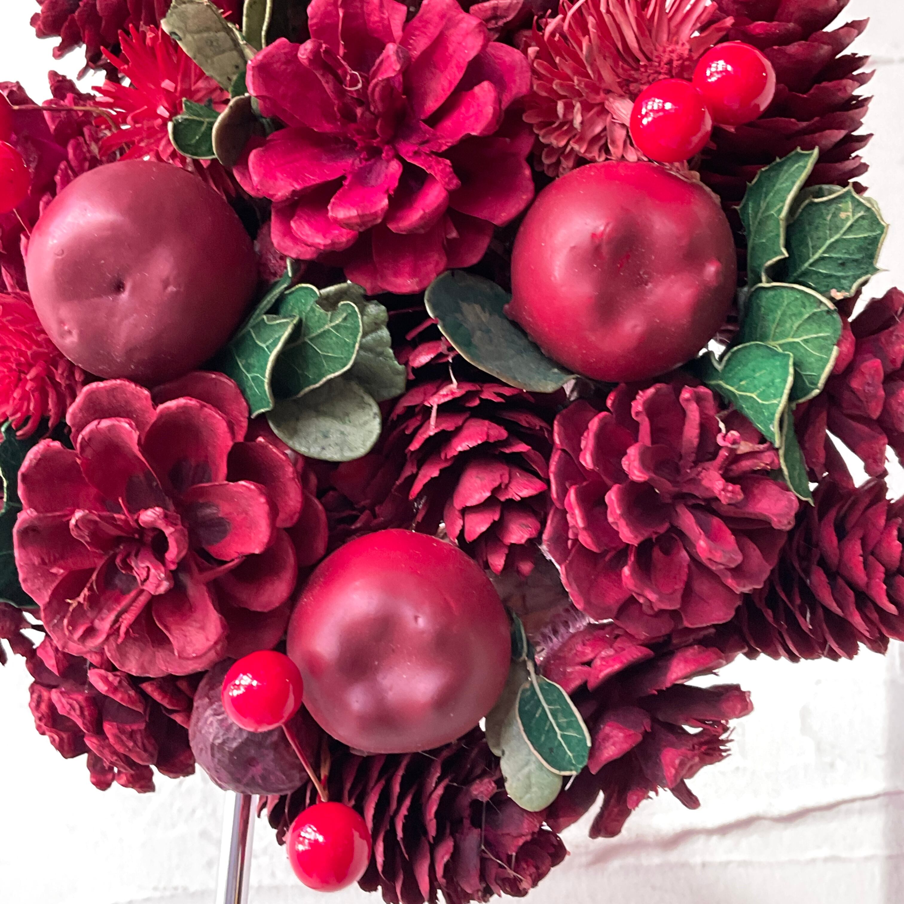 つややかな赤い木の実の飾りと葉っぱの緑がアクセント。