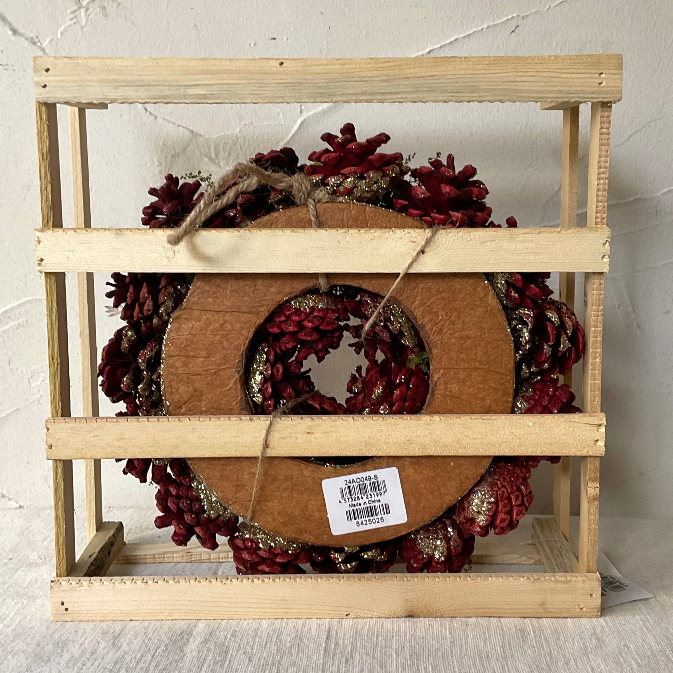 リースを守るための緩衝材として、木枠に麻紐で固定されています。