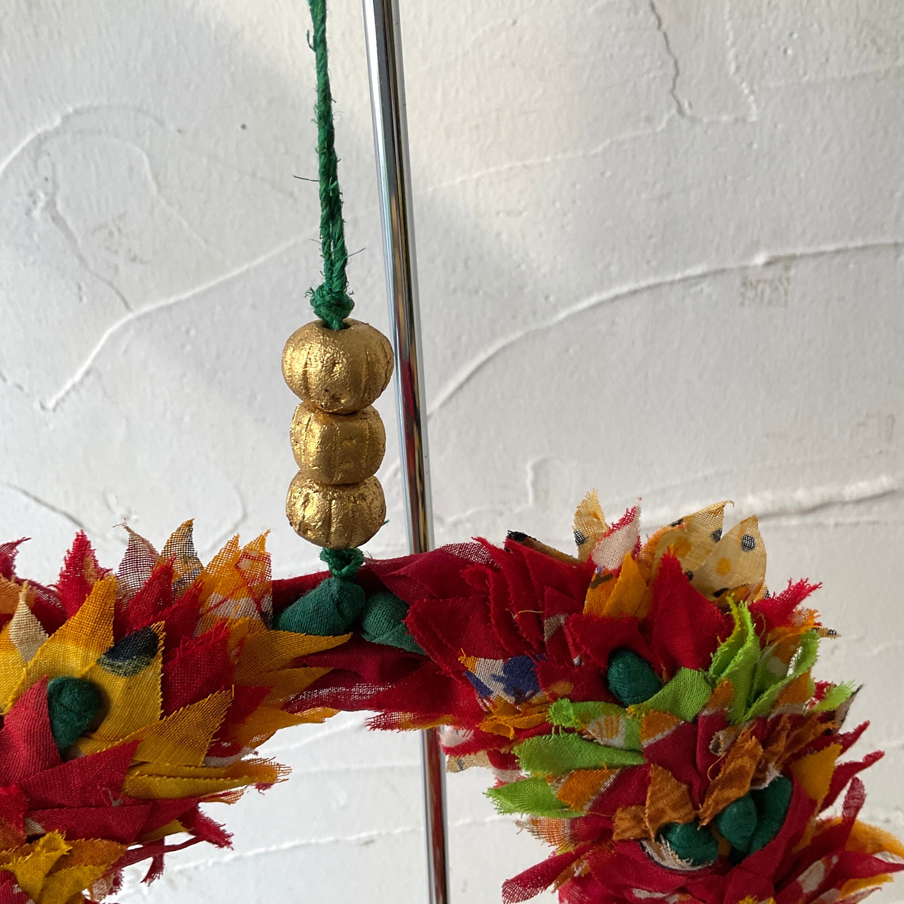 暖色系のリサイクルサリーを使ってつくられたリース。