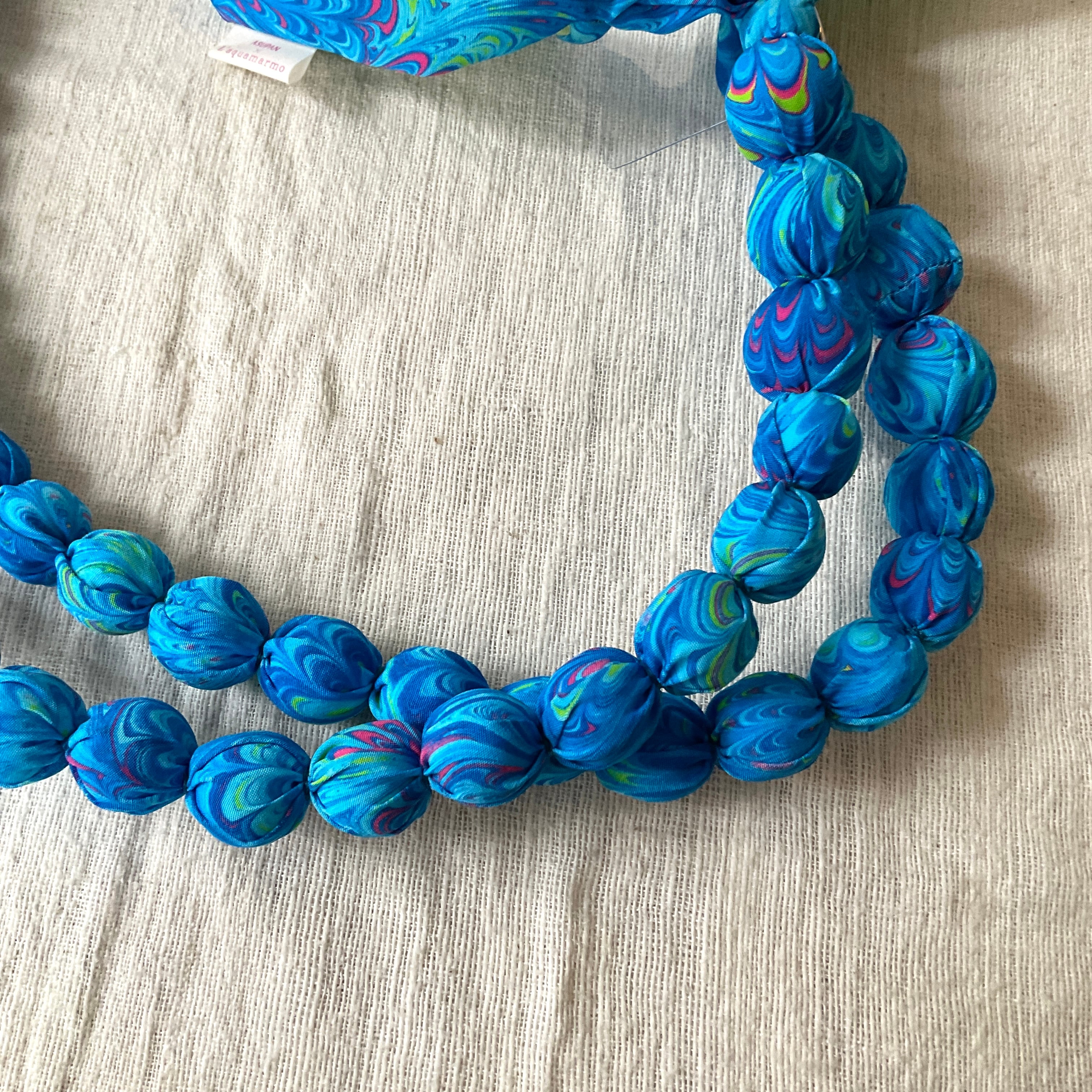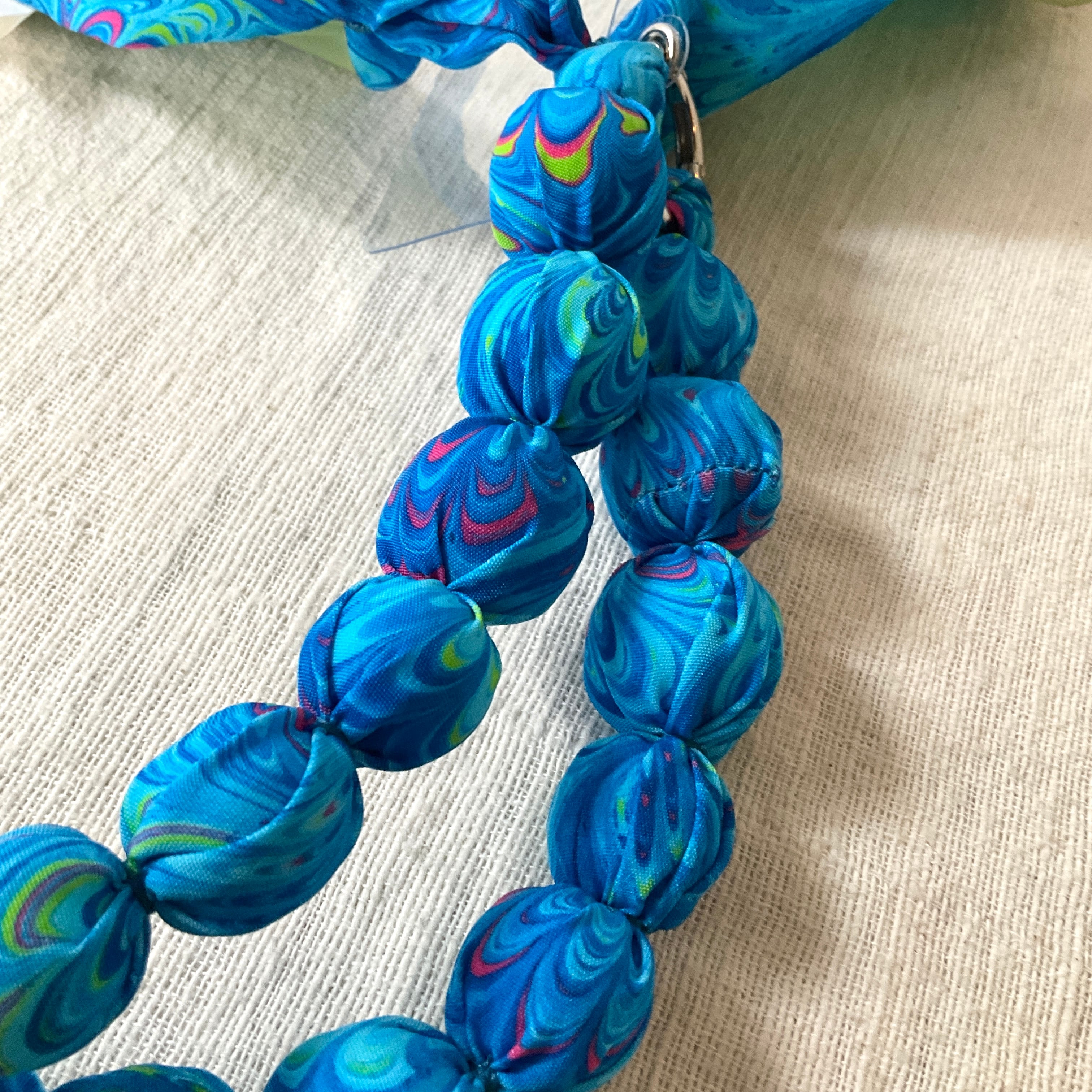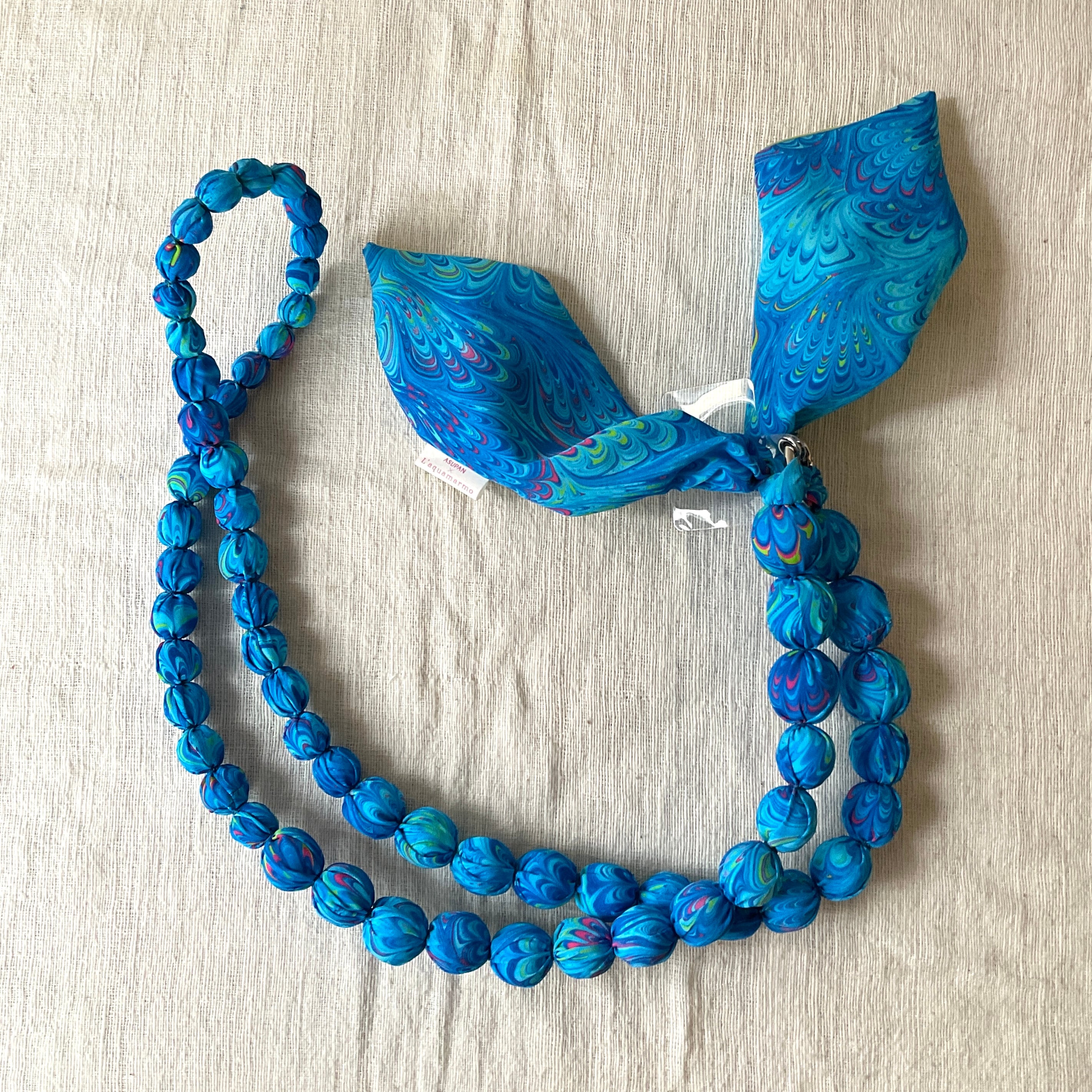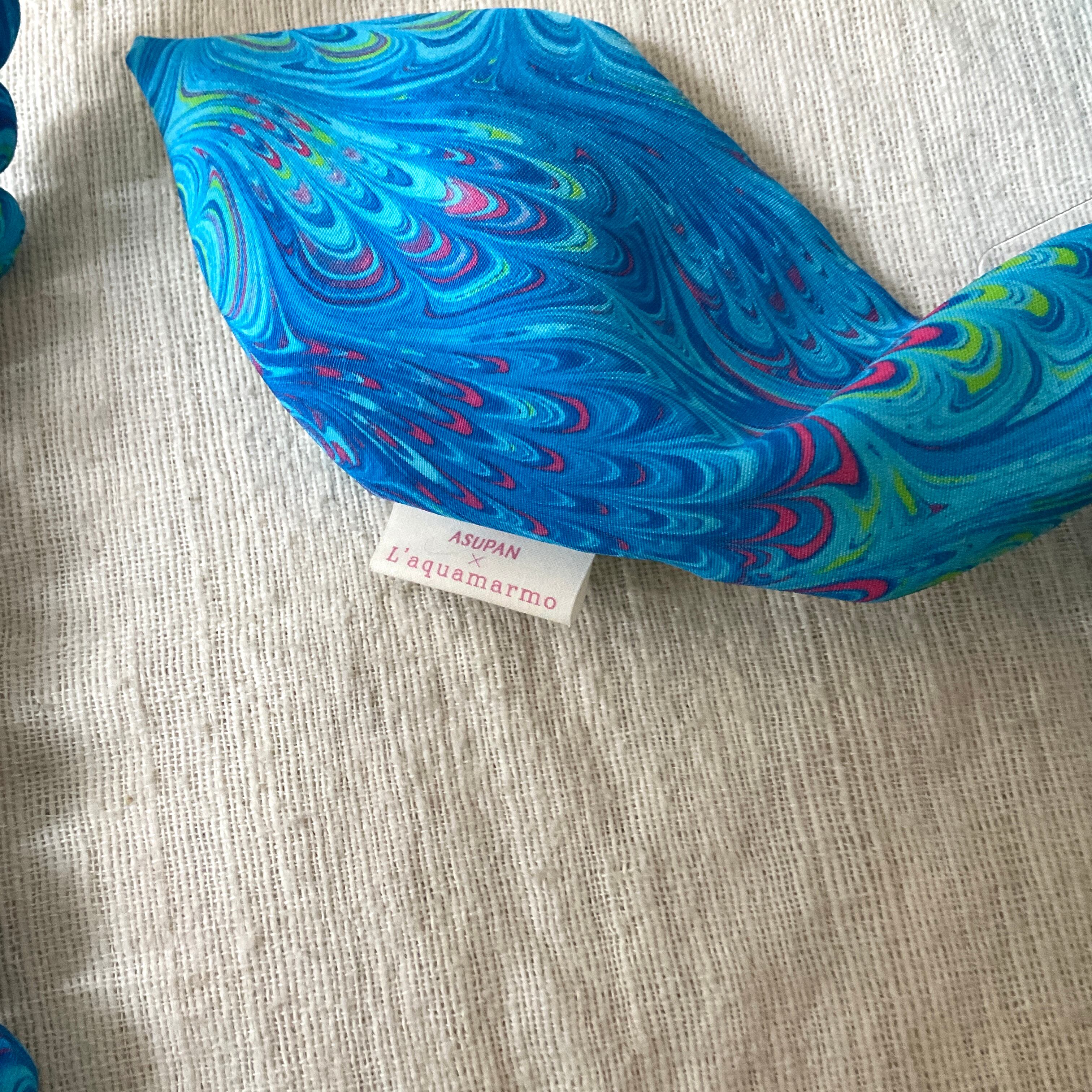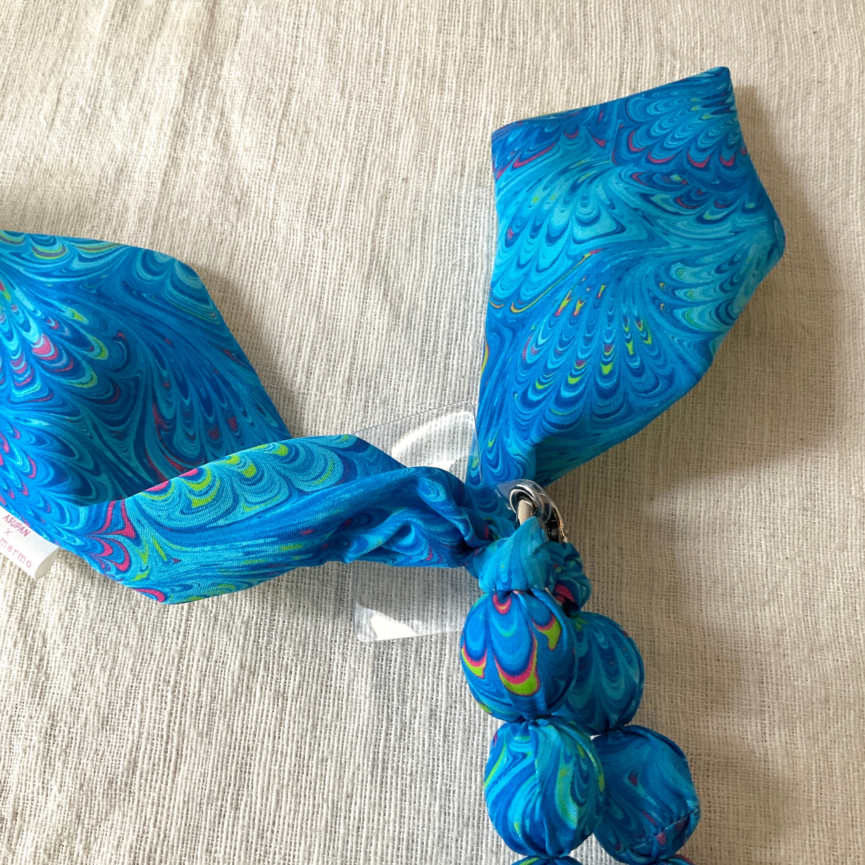 ネクタイをリメイクして、ぽこぽこした造形の可愛らしいストラップを制作するアーティスト「Asupan」さんと、水面に描いたマーブル模様を紙に写し取ったイタリア伝統の技法「マーブリング」の作家「L’aquamarmo」さんのコラボ商品です。