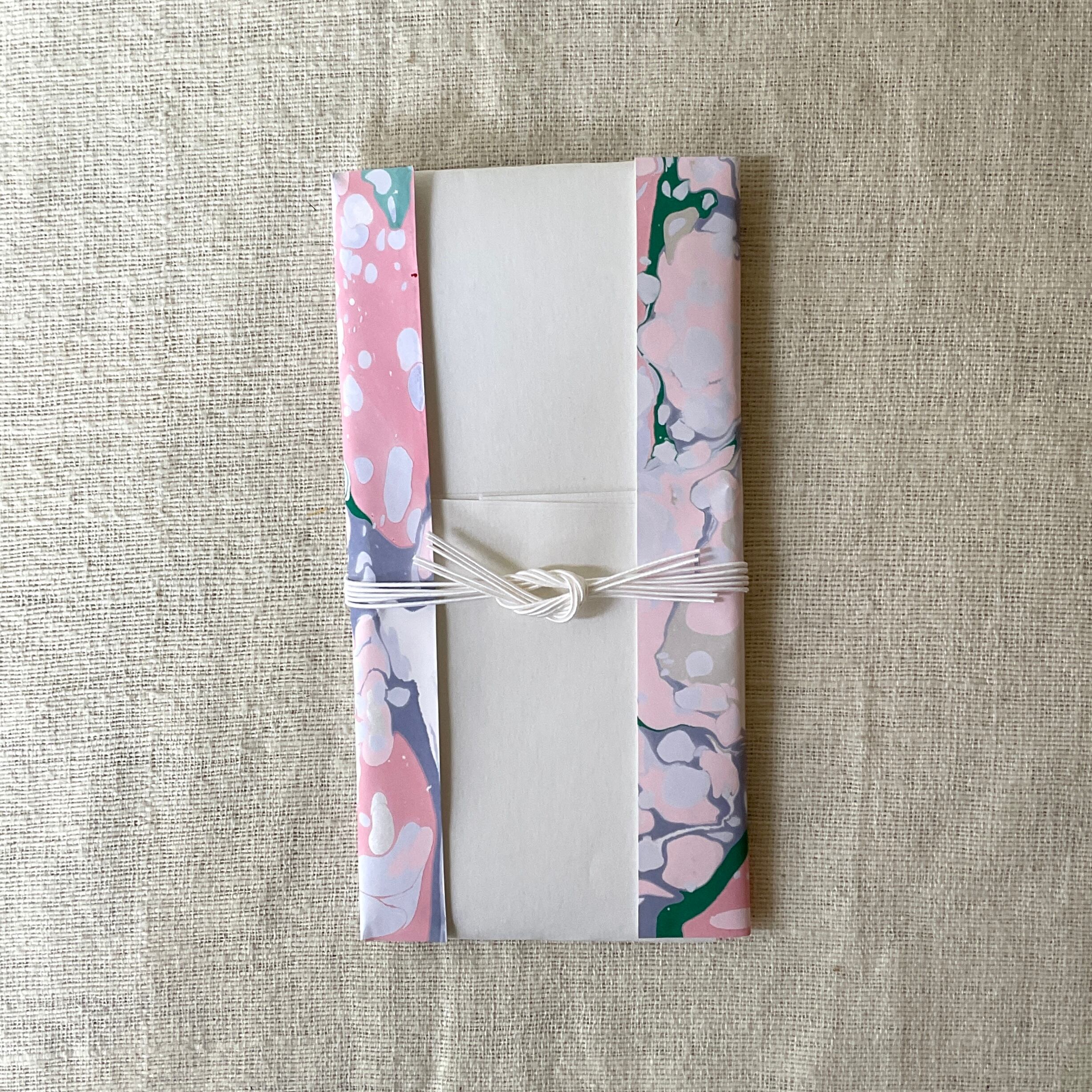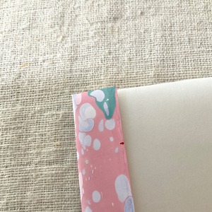 水面に描いたマーブル模様を紙に写し取ったイタリア伝統の技法「マーブリング」の作家「L’aquamarmo」(らっくあまるも)さんが、一枚一枚手染めした紙で製作されています。