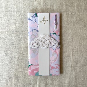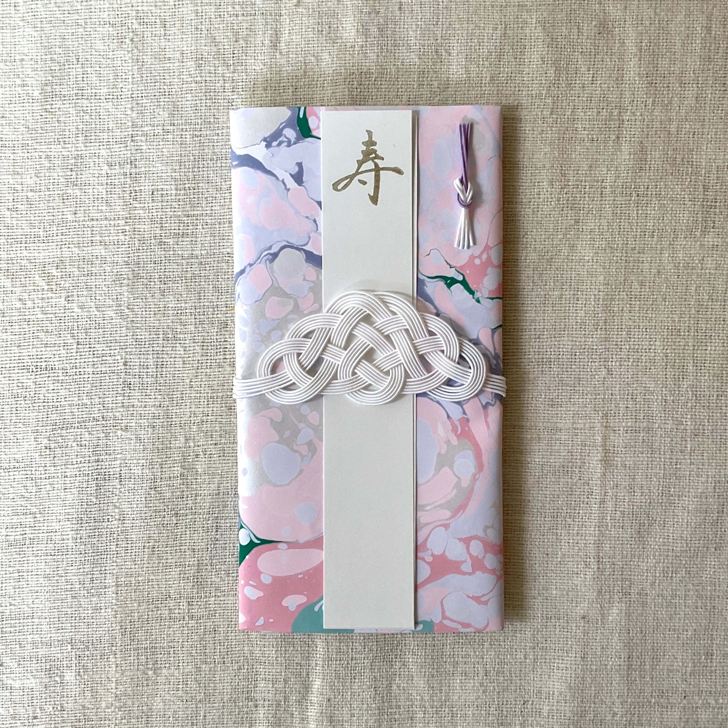 ・内容物:本体(マーブル紙)、短冊2枚(1枚は”寿”、もう1枚は”無地”)、水引、金封1枚、台紙1枚