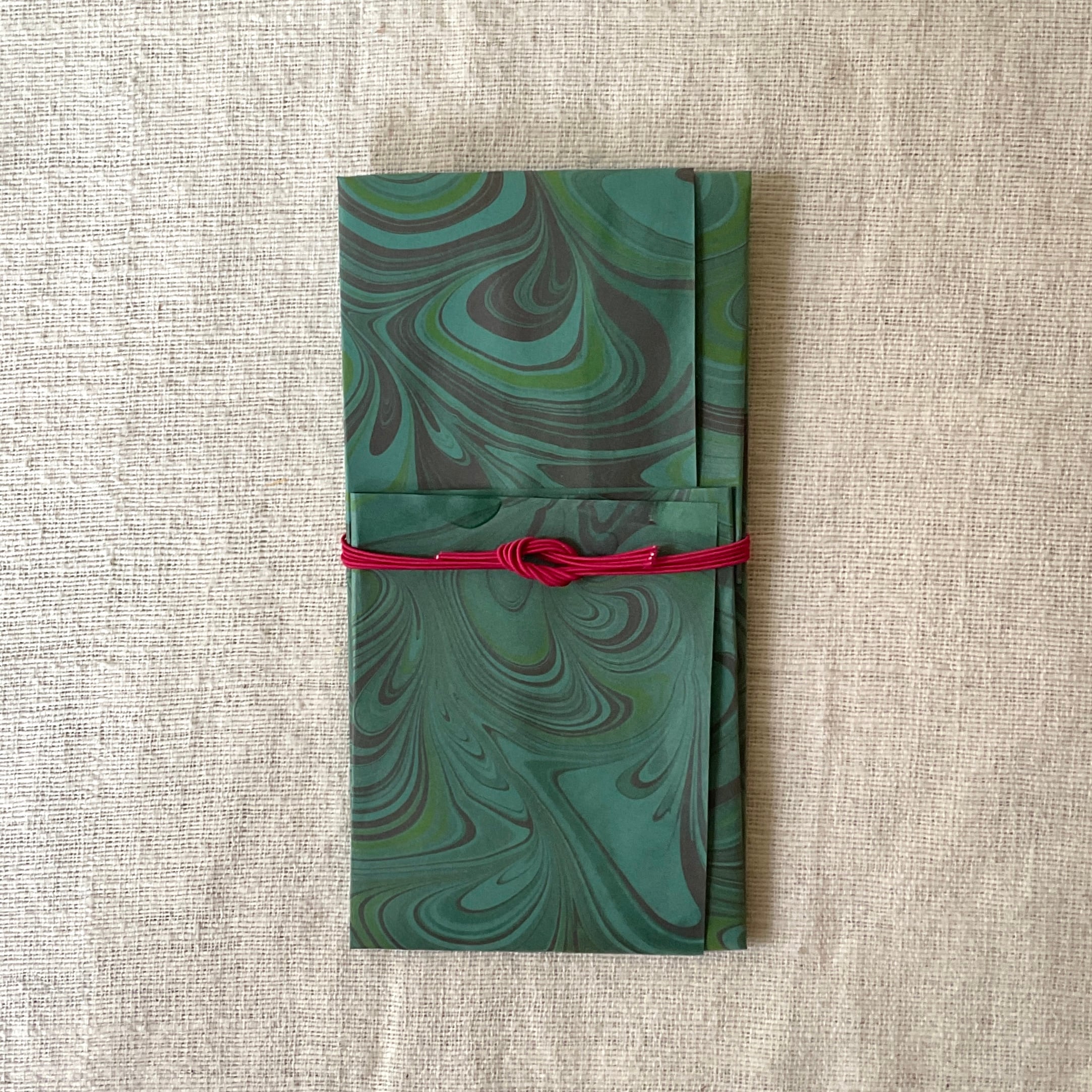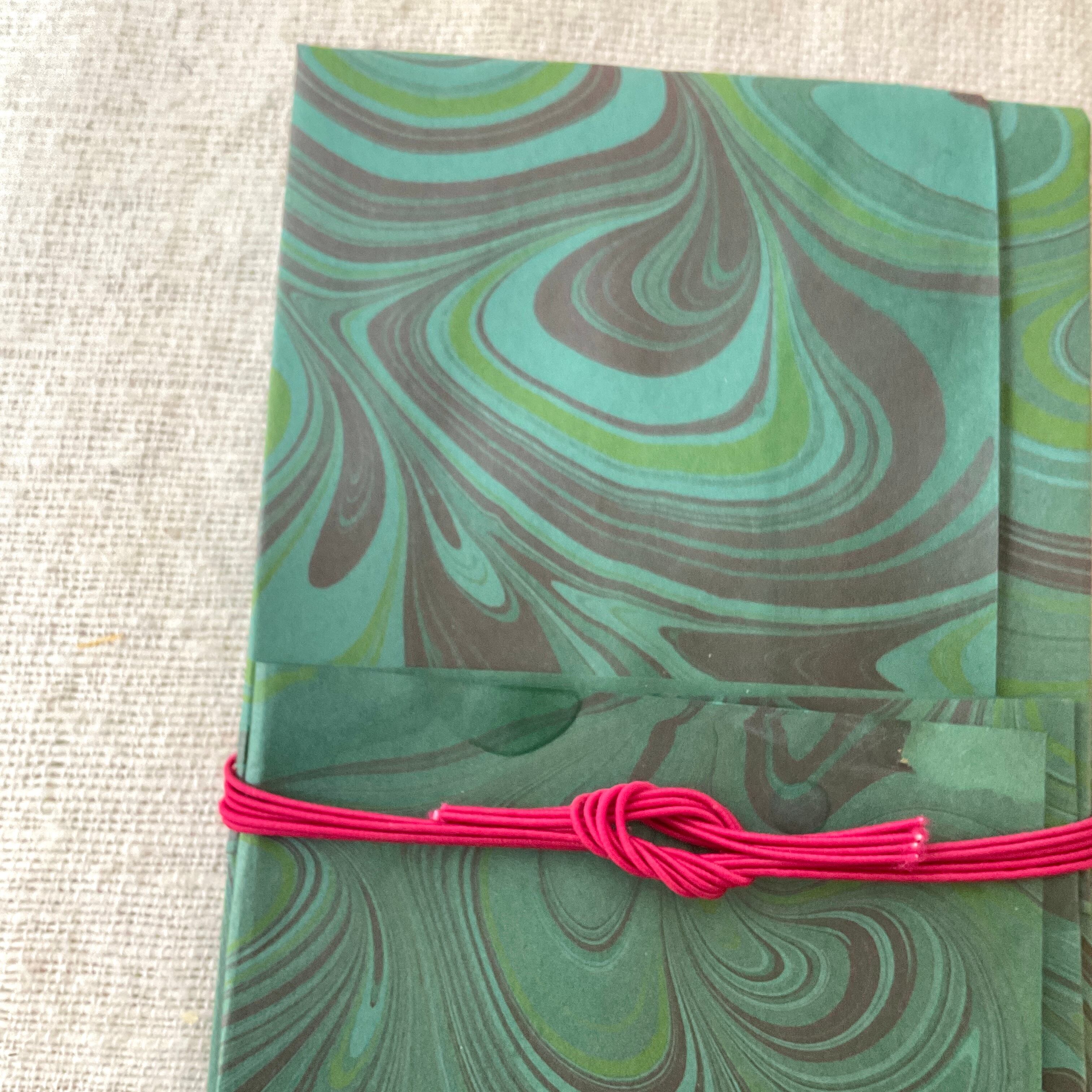 水面に描いたマーブル模様を紙に写し取ったイタリア伝統の技法「マーブリング」の作家「L’aquamarmo」(らっくあまるも)さんが、一枚一枚手染めした紙で製作されています。
