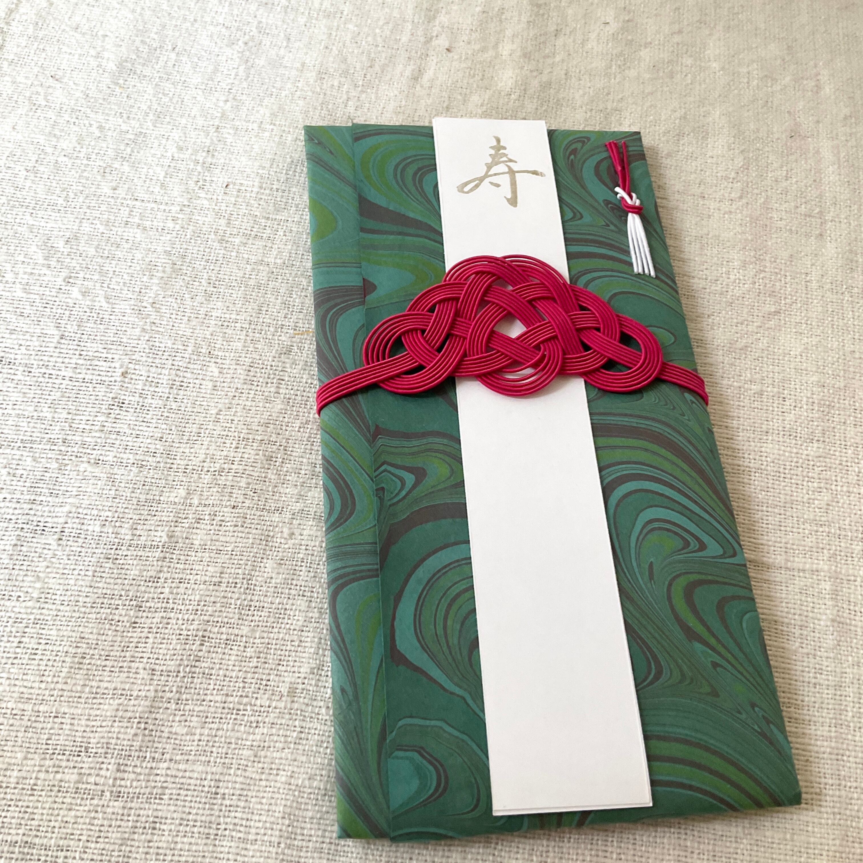 ・内容物:本体(マーブル紙)、短冊2枚(1枚は”寿”、もう1枚は”無地”)、水引、金封1枚、台紙1枚