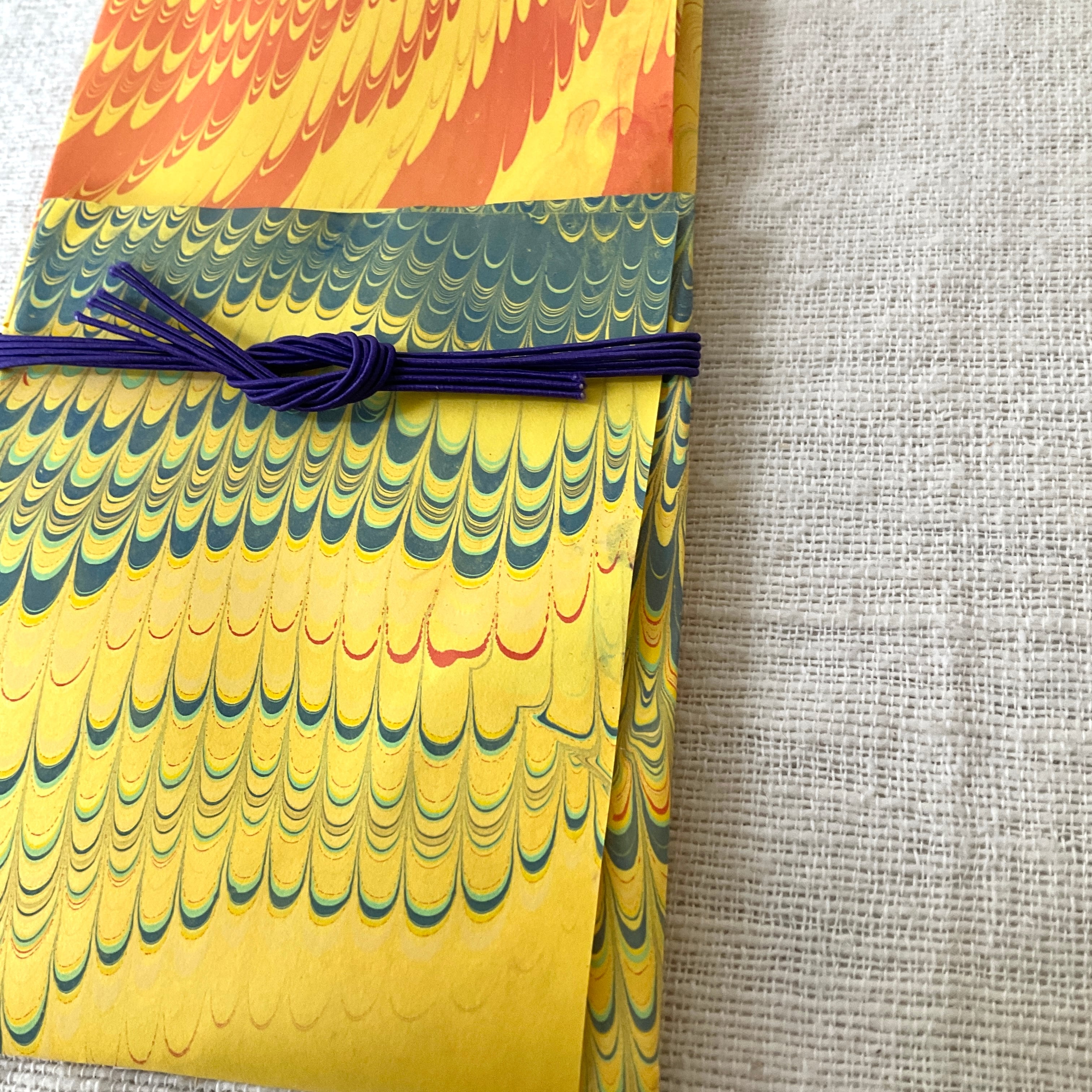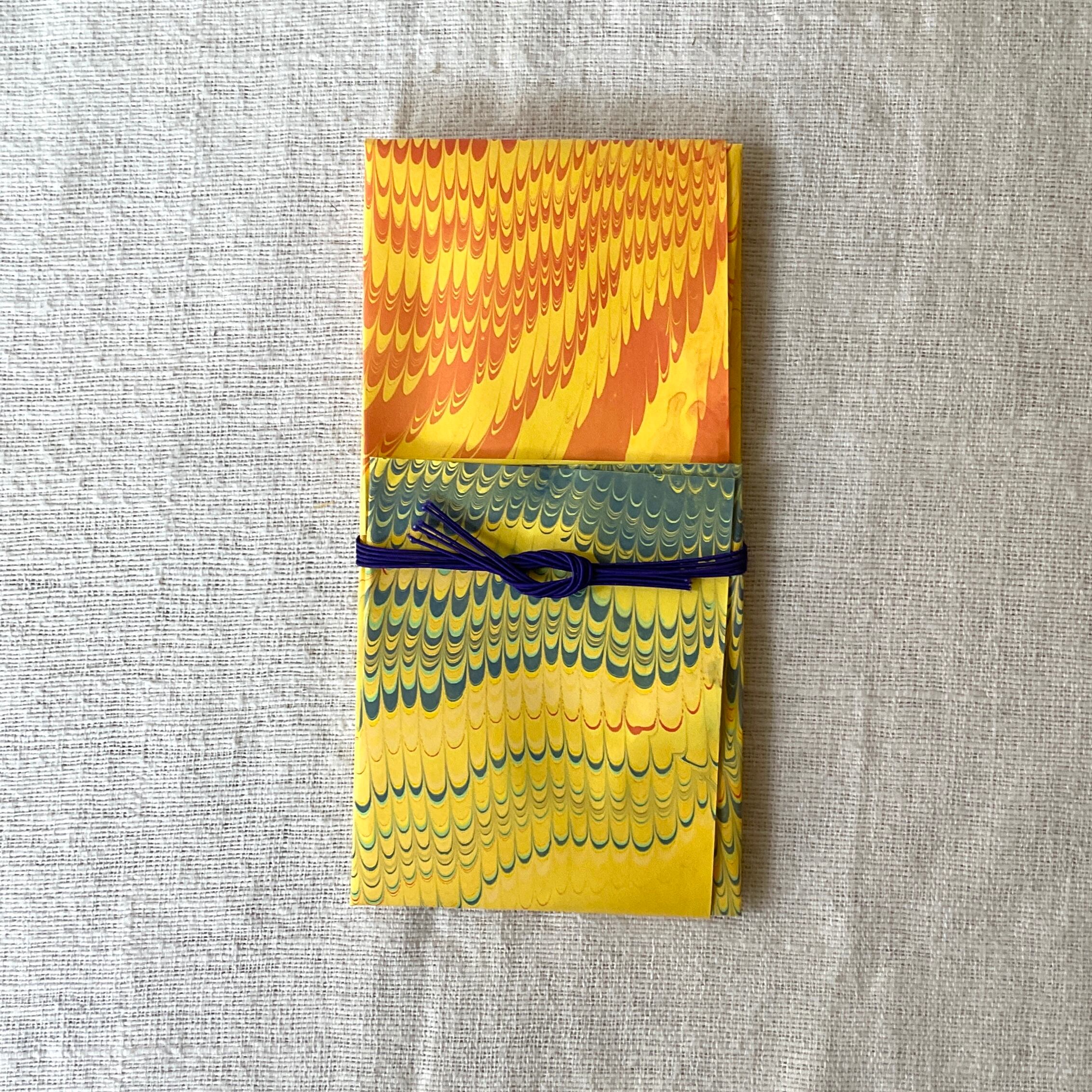 水面に描いたマーブル模様を紙に写し取ったイタリア伝統の技法「マーブリング」の作家「L’aquamarmo」(らっくあまるも)さんが、一枚一枚手染めした紙で製作されています。