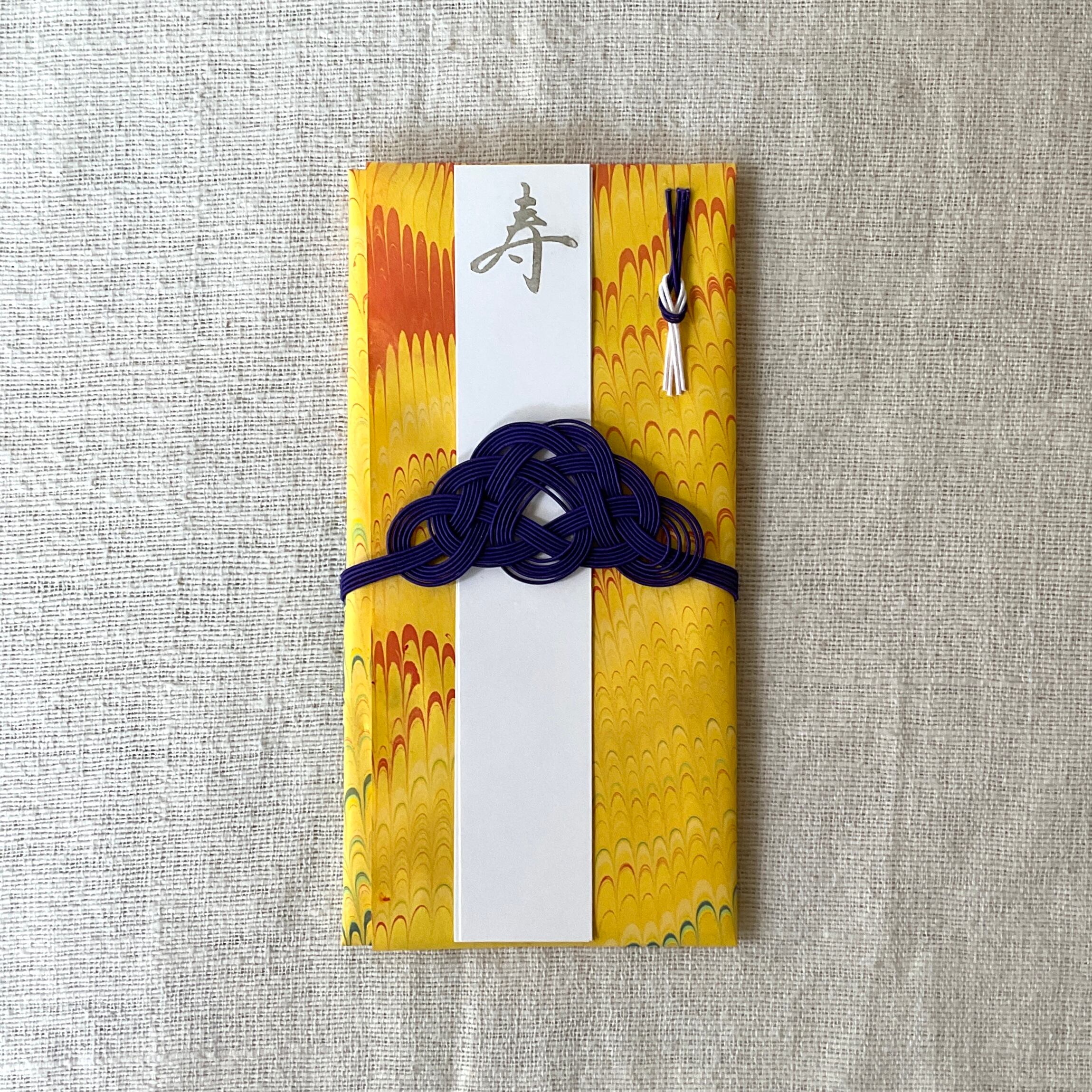 ・内容物:本体(マーブル紙)、短冊2枚(1枚は”寿”、もう1枚は”無地”)、水引、金封1枚、台紙1枚