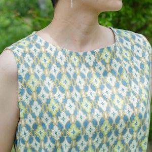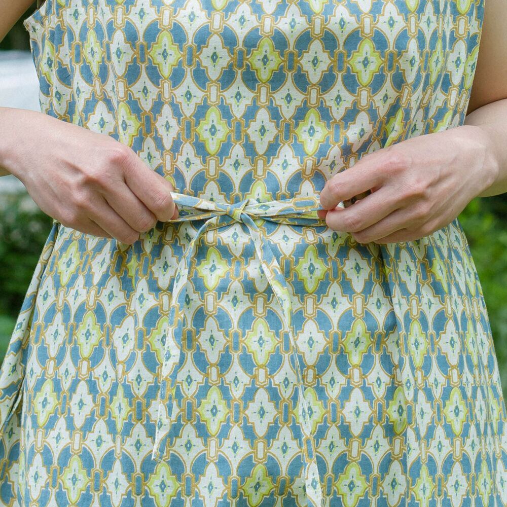 開きすぎないボートネックは上品で、ゆるやかなカーブラインが一枚で着ても美しいシルエットを演出。背面は涙開き仕様で、タイル柄の中にさりげない抜け感をプラスしています。共布のウエストリボン付きで、気分に合わせてシルエットを変えられるのも魅力です。