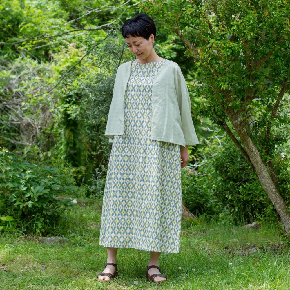 ハリがあるため体にまとわりつかず、真夏でもさらりと快適に過ごせます。プリントはハンドスクリーンによる手仕事で、一枚一枚に温かみが宿ります。