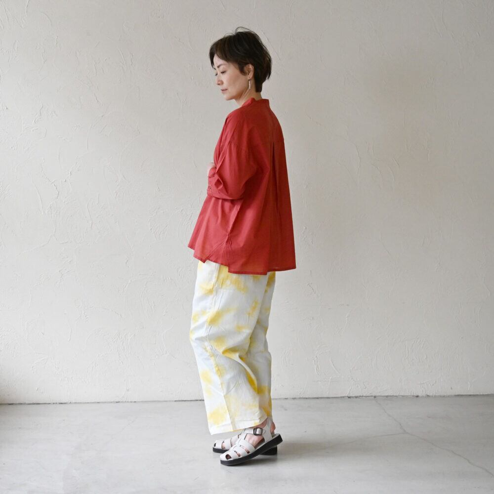 薄手で透け感のあるスラブ生地は、風をふんわり含んで涼しく、真夏でも快適。太さにムラのあるスラブ糸が生み出す、絣のような奥行きのある表情もポイントです。