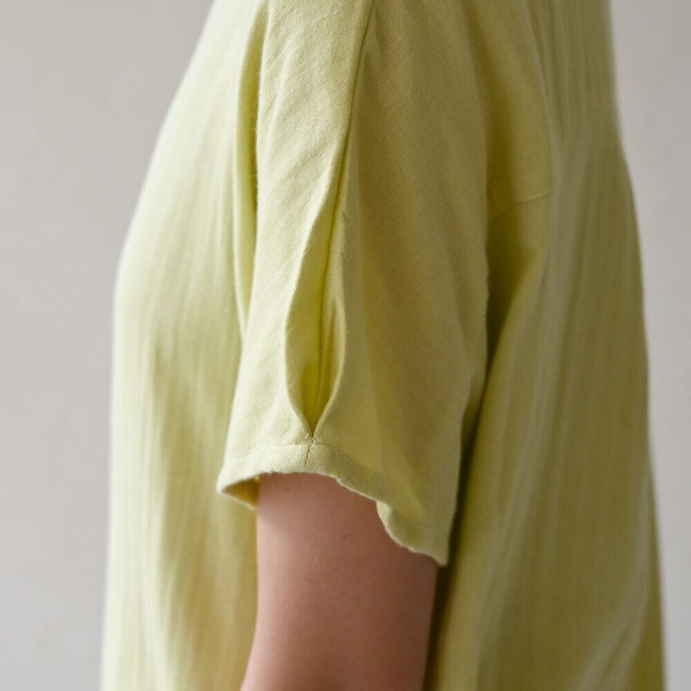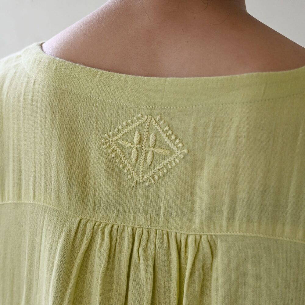 背守りのように施された手刺繍のワンポイントは、一針一針に作り手の個性が宿る特別なアクセント。爽やかで可愛らしいライムカラーは、一枚での着用はもちろん、チェックシャツを羽織ったカジュアルコーデにもぴったりです。