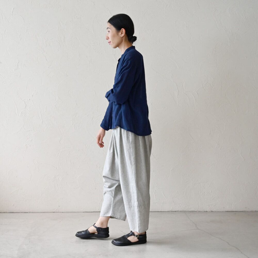 オーガニックコットン100%の生地は、凹凸のある織りが涼しく、遠目には無地のように見える合わせやすさも魅力。