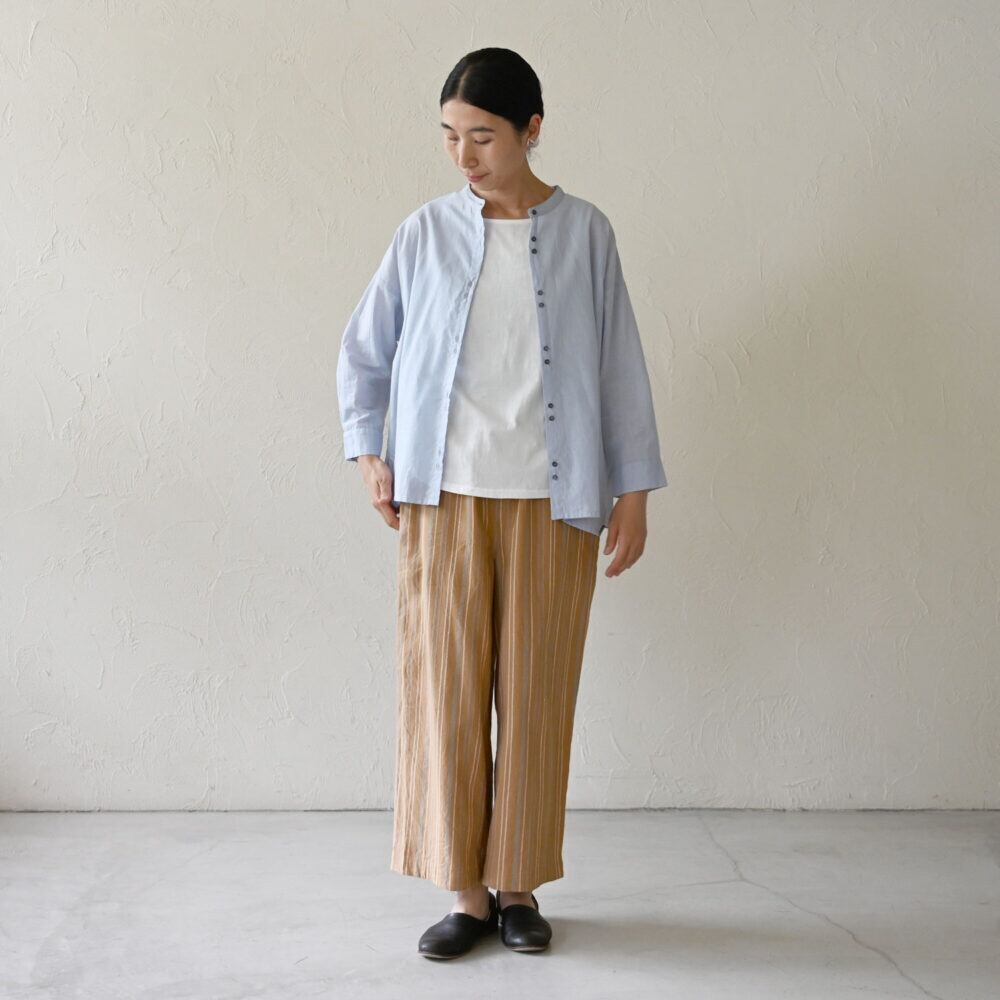 薄手で透け感のあるスラブ生地は、風をふんわり含んで涼しく、真夏でも快適。太さにムラのあるスラブ糸が生み出す、絣のような奥行きのある表情もポイントです。