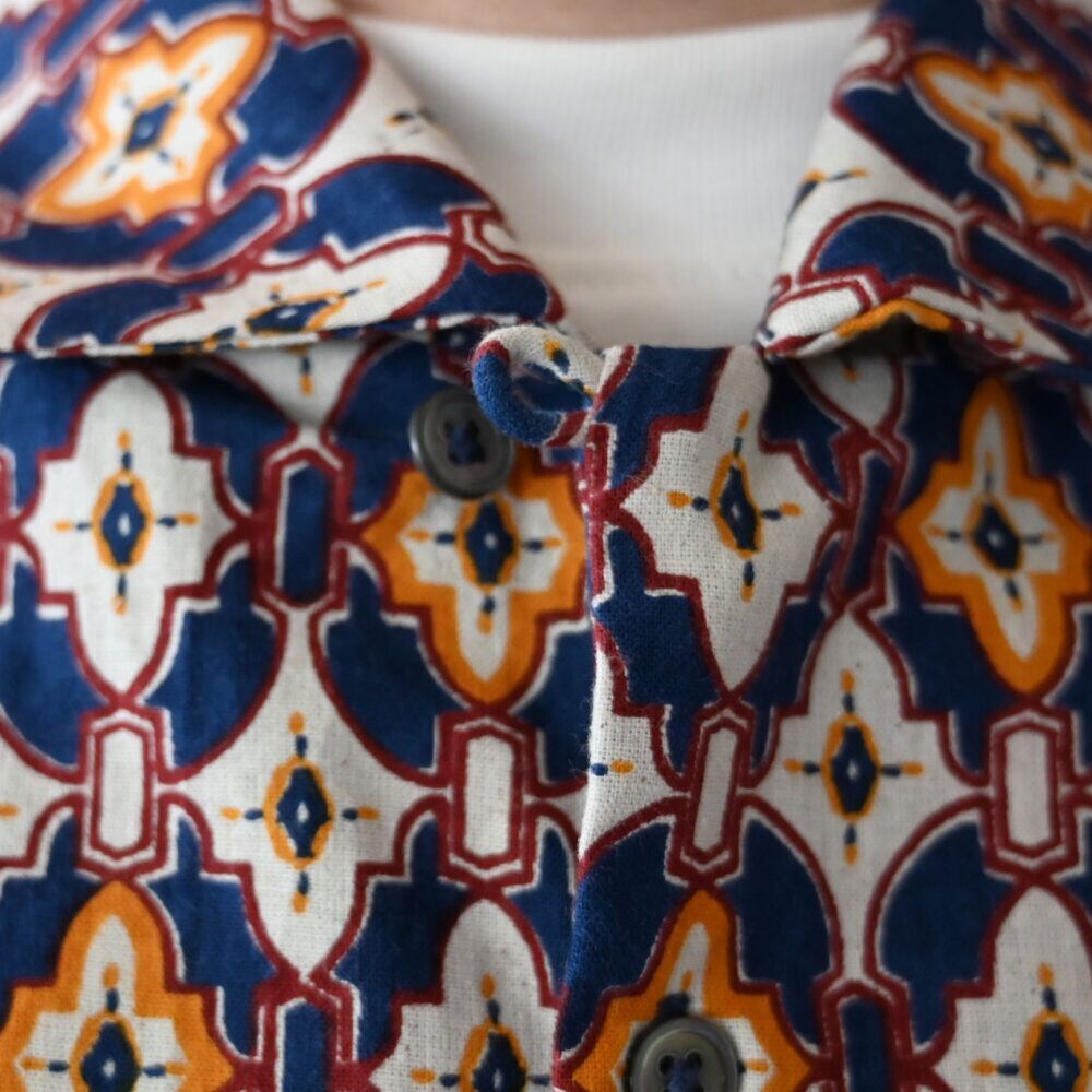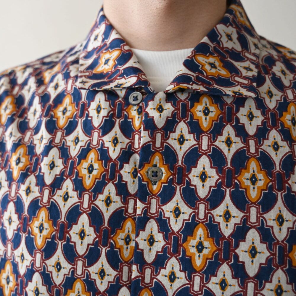毎シーズン人気のハンドスクリーンプリントシャツが、今季はモロッコの街角のタイルを思わせるエキゾチックな柄で登場しました。シーズンテーマ「Transit」から着想を得た、旅情あふれるデザインが魅力です。