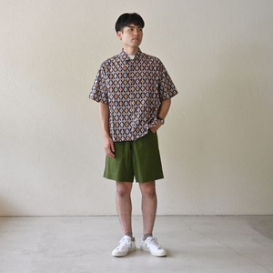 少し太めの糸で織った平織りコットン生地は、ほどよいハリがあり、真夏でも体にまとわりつかず風が通る快適な着心地。プリントは手作業のハンドスクリーンで、一枚一枚に温かみが宿ります。