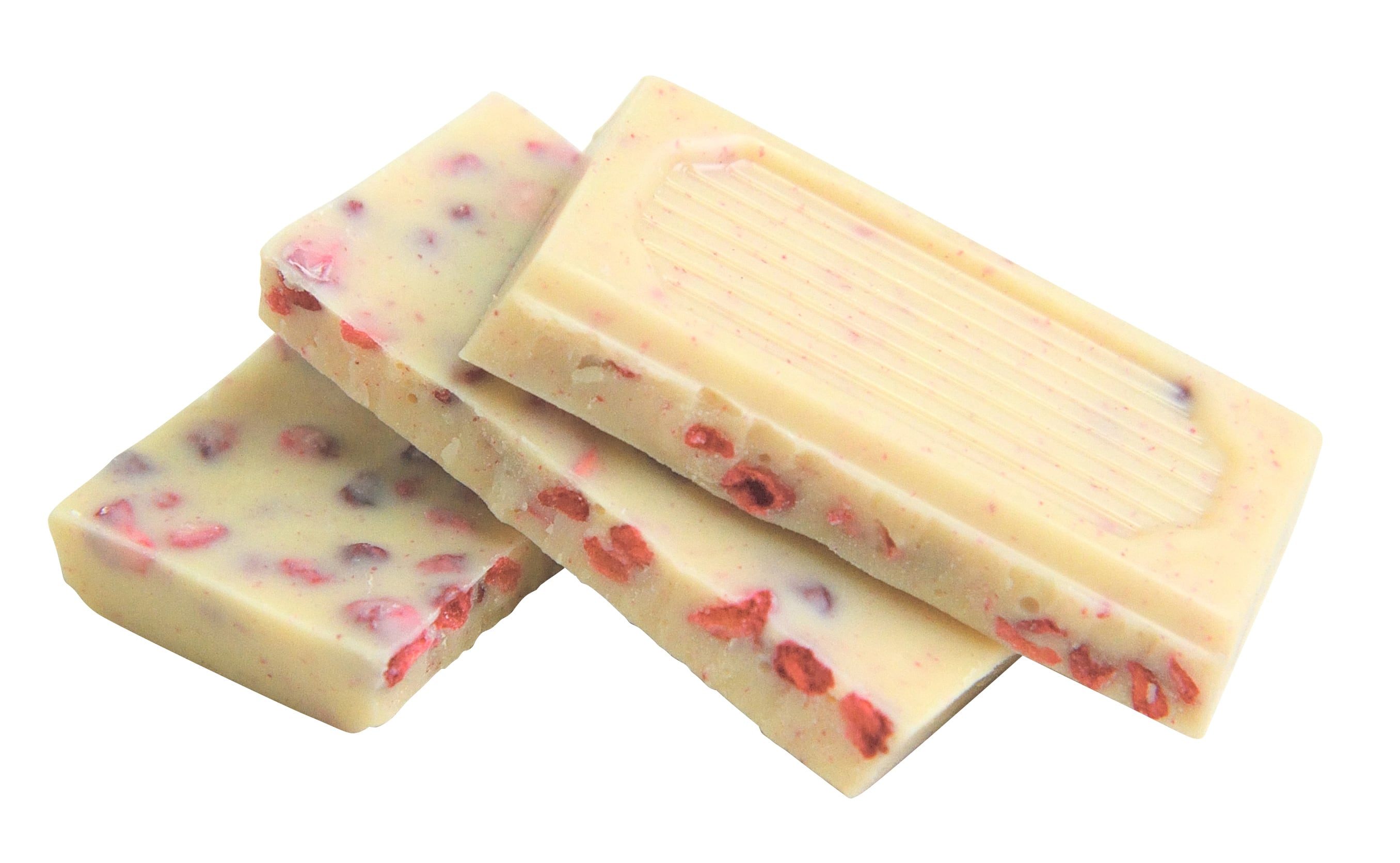 粗糖・ココアバター・ミルクだけで作られたシンプルなホワイトチョコに、甘酸っぱく香り高いラズベリーのつぶつぶ果肉がたっぷり。