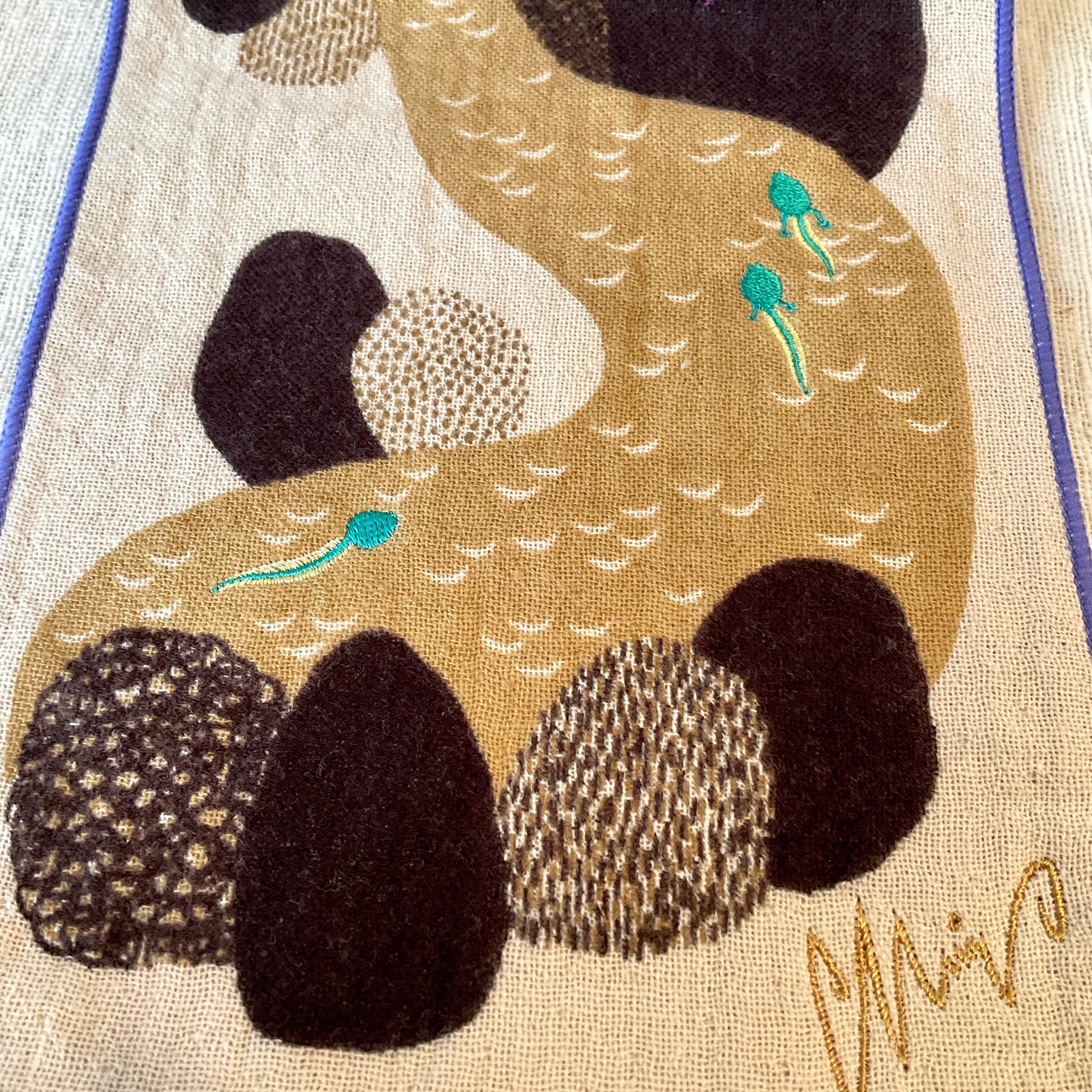 可愛くてちょっと不思議な世界観を織りなす、美しい色の組み合わせやモチーフが、肌触りの良い丁寧な織りと、緻密な刺繍で表現されています。