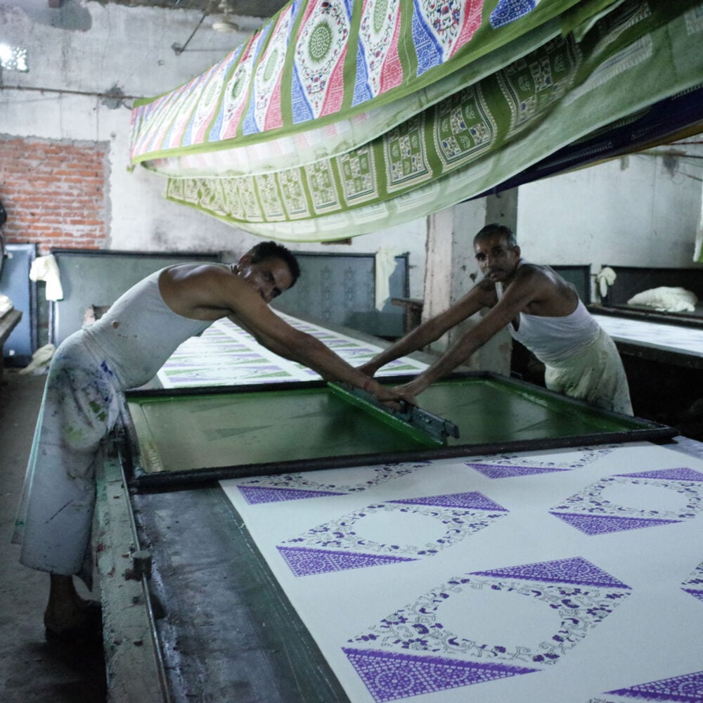 木版プリントやスクリーンプリントの工場が並ぶ、インドのサンガネールという街の布を使用しています。