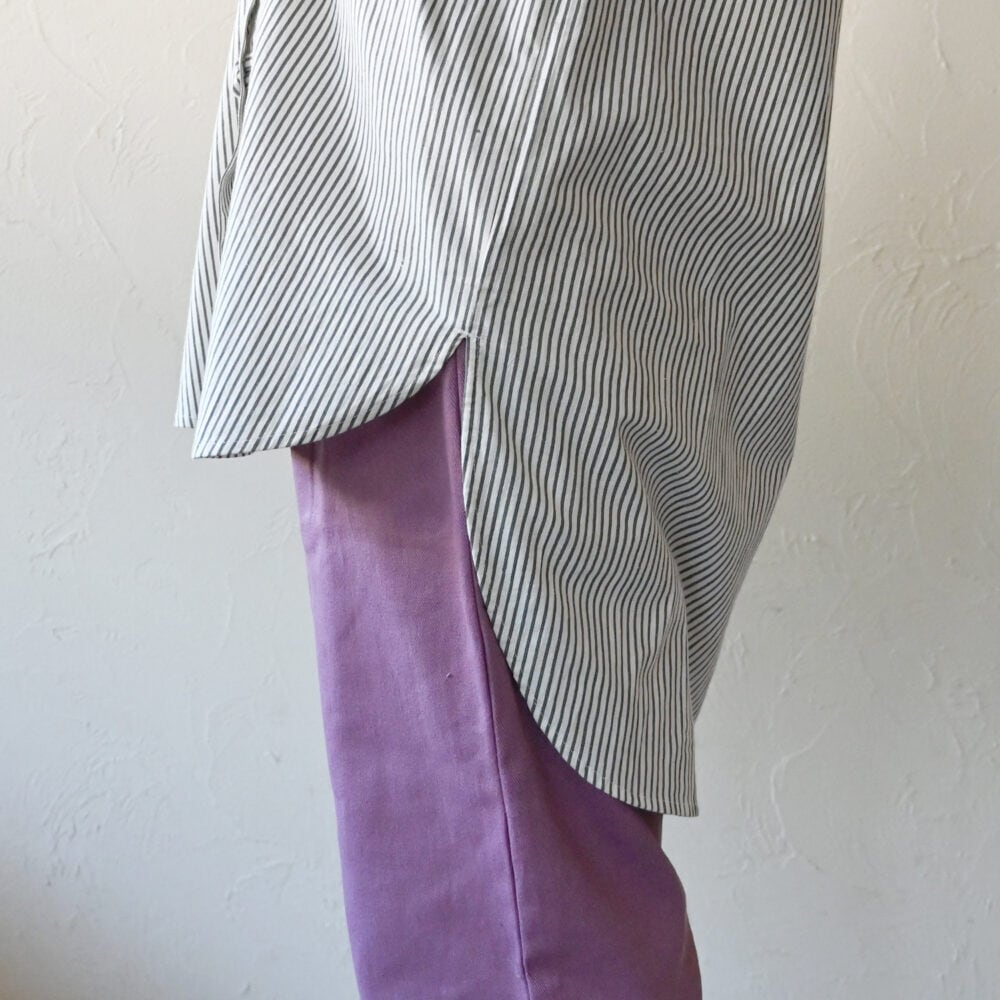ハリのある生地の、タテシマ・ループボタンなロングシャツ。
