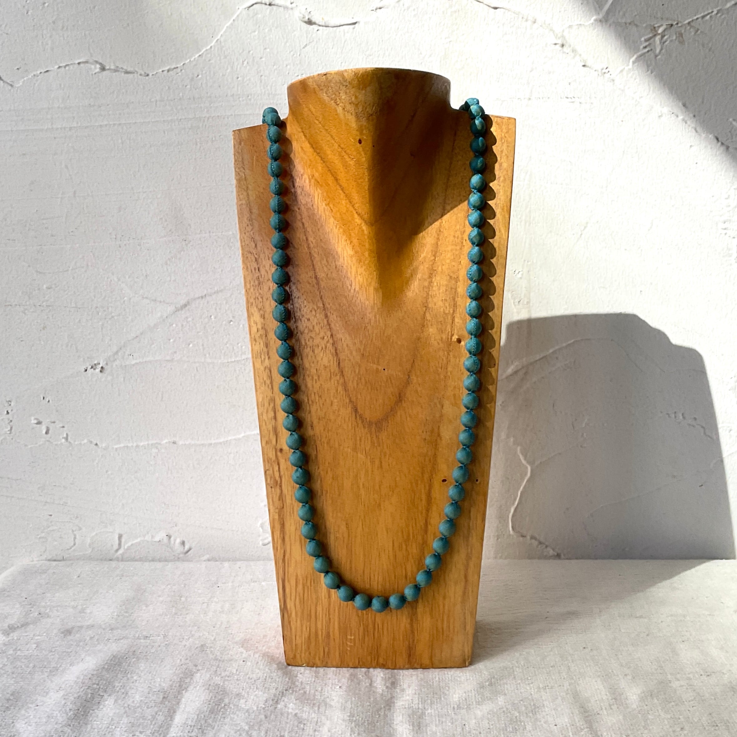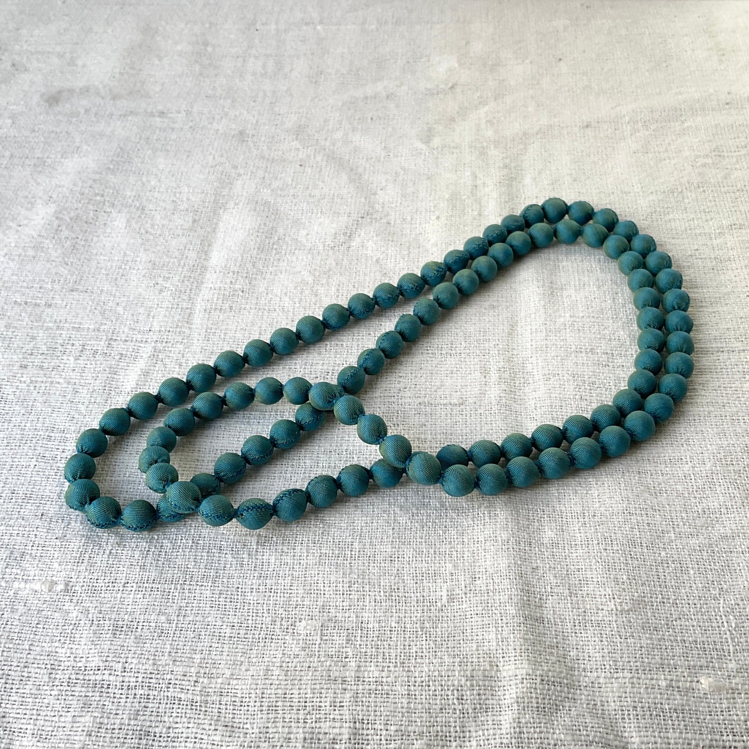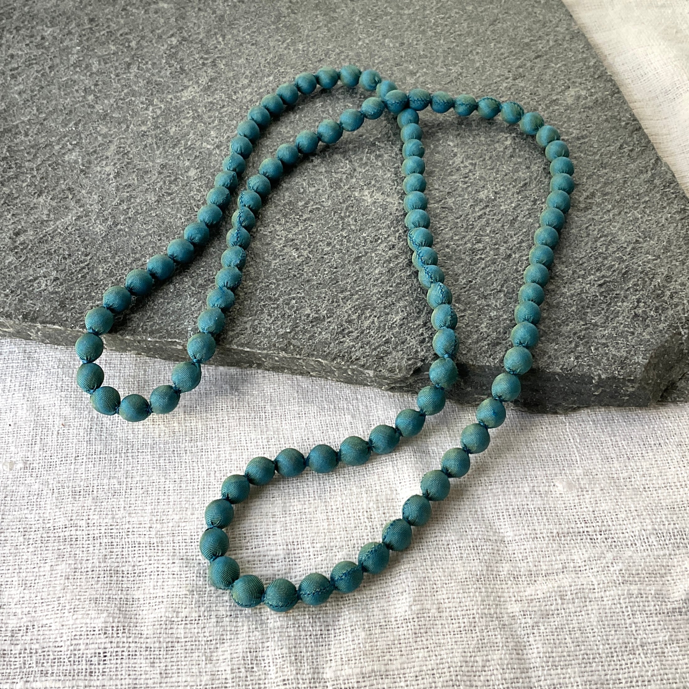 熟練の技で、プラスチックビーズを手織りのシルク生地で巻いたボールが連なっています。